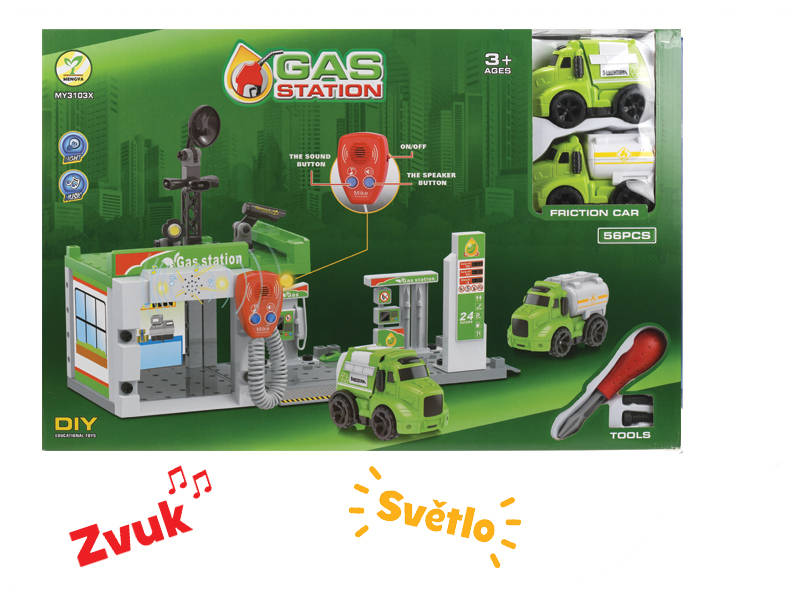Benzinová stanice 51,5x21x33cm s auty 2ks na baterie se světlem a zvukem s doplňky v krabičce