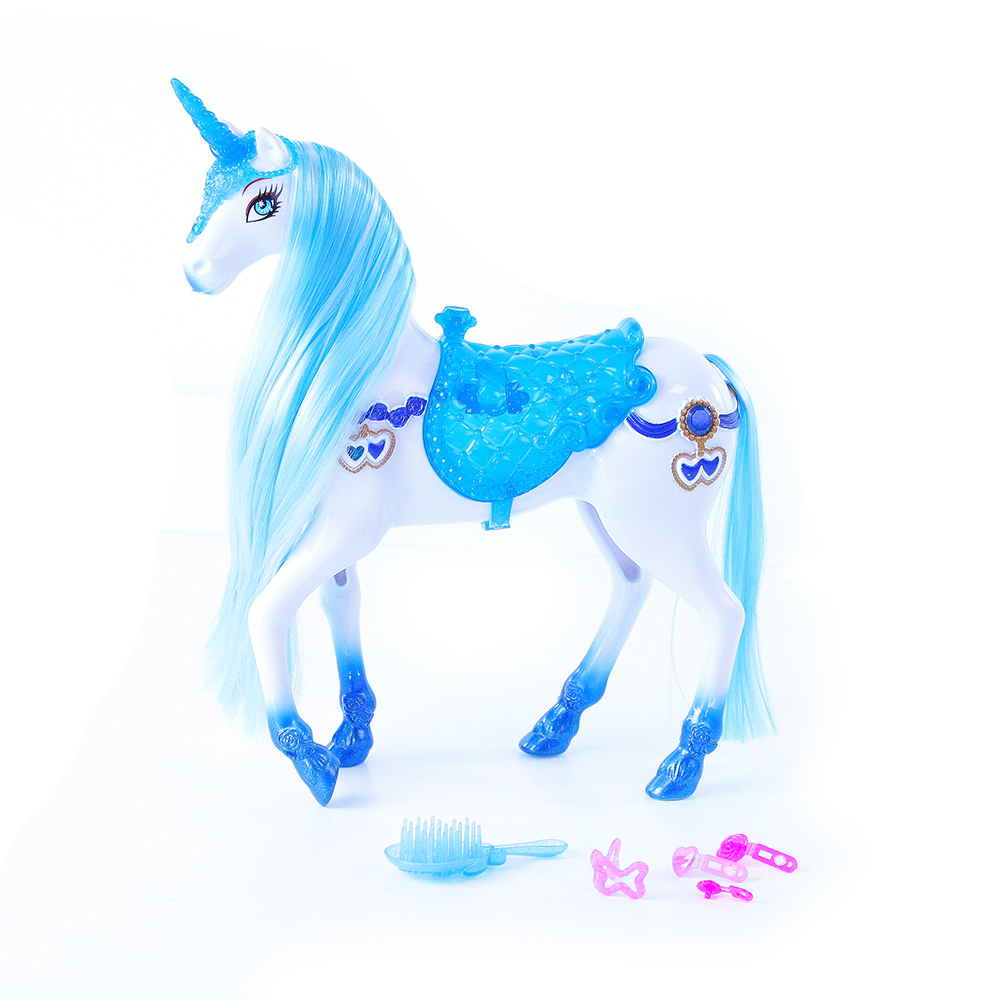 Modro-bílý kůň se stane klenotem ve stáji tvých panenek! Koník tě uchvátí svým stylovým sedlem, ale hlavně překrásnou hřívou, kterou můžeš upravovat přiloženým hřebínkem a doplňky. Stisknutím tlačítka vydává zvuky a bliká korunka a sedlo. Vyžaduje 3 ks baterií AG13, které jsou součástí balení.