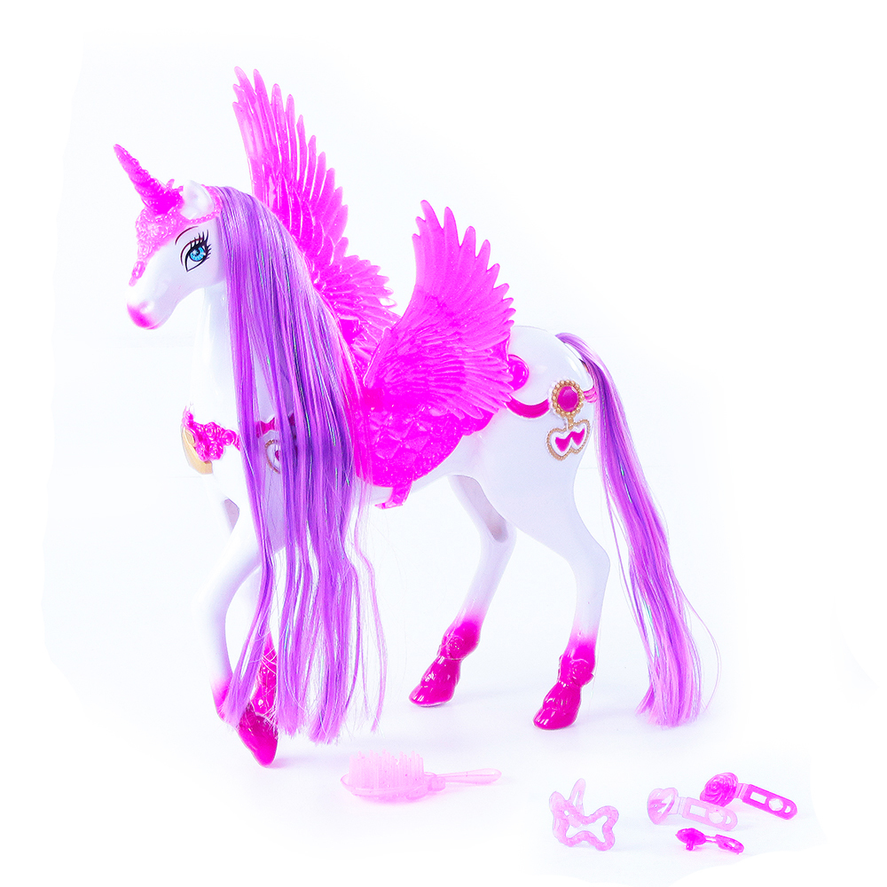Osedlej si okřídleného bílo-růžového koně a na chvíli se přenes do kouzelného světa pohádek! Kůň má krásnou dlouhou hřívu, kterou můžeš česat přiloženým hřebenem. Když koně zapneš, začne vydávat reálné zvuky a svítí. Vyžaduje 3 ks baterií AG13, které jsou součástí balení.