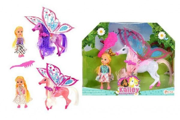 Kůň 27cm s křídly a hřebenem česací + panenka 15cm plast 3 barvy v krabici