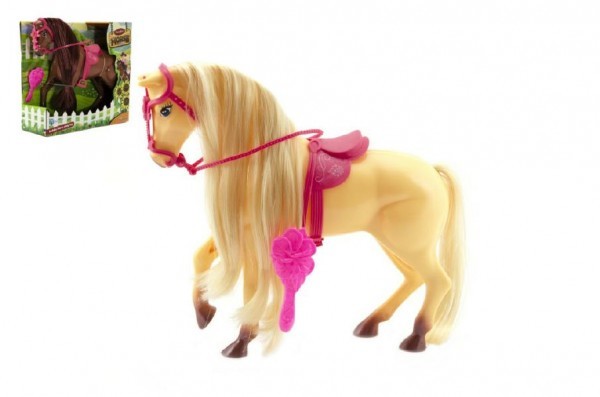Kůň s hřívou časací s doplňky plast 28 cm, 2 barvy (1ks v krabici)