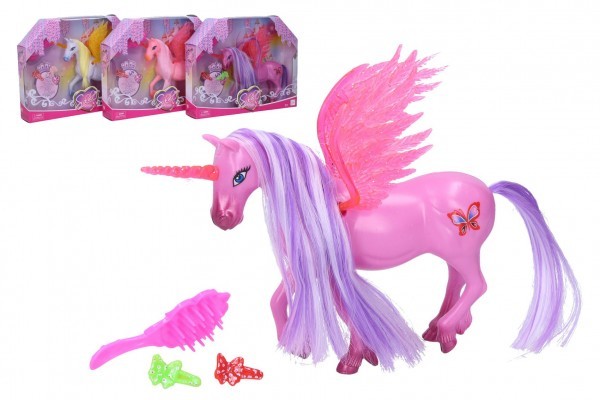 Jednorožec/kůň s křídly česací s doplňky plast 20 cm 2 barvy v krabičce 25x20x5cm