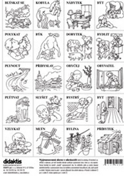 Každý list obsahuje 20 čtverečků - kartiček k vystříhání a vybarvení, které tvoří černobílý obrázek vystihující vyjmenované slovo, které je u něj psacím písmem napsáno.