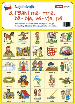 Procvičování psaní mě - mně, bě - bje, vě - vje, pě formou hry. Obsahuje 35 dvojic, záložku a krabičku. Pravidla hry: Hra je určena nejméně pro 2 hráče. Kartičky rozstříhejte, promíchejte a obrázky dolů rozložte na plochu. Každý hráč obrátí kartičku a obrácením druhé hledá k obrázku dvojici. Když neuhodne, vrátí je do původní polohy. Když uhodne, získá dvojici a pokračuje ve hře. Vítězem se stává hráč, který našel nejvíce obrázkových dvojic.