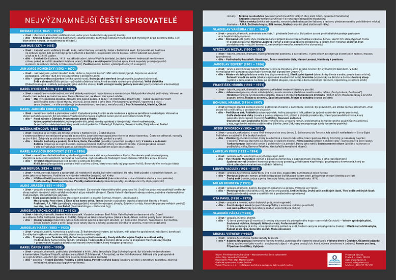 Přehledová tabulka učiva – Přehled českých spisovatelů zpracovaný do přehledného souhrnu. Celkem 24 autorů, jejich život a nejvýznamnější díla pro snadné zapamatování.