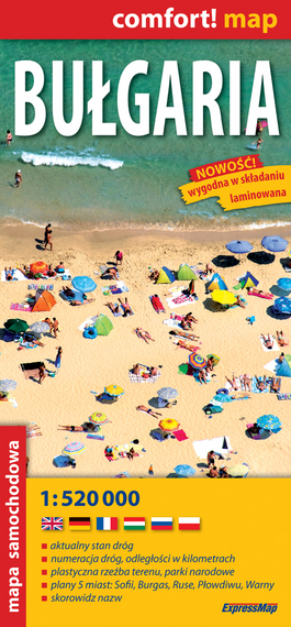 Dwustronnie laminowana, wygodna w składaniu i trwała mapa samochodowa Bułgarii:stan dróg 2012, odcinki w budowieszczegółowa kategoryzacja i numeracja drógodległości drogowe w kilometrachlotniska międzynarodoweplastyczna rzeźba terenu, lasy, parki narodoweskorowidz miejscowości