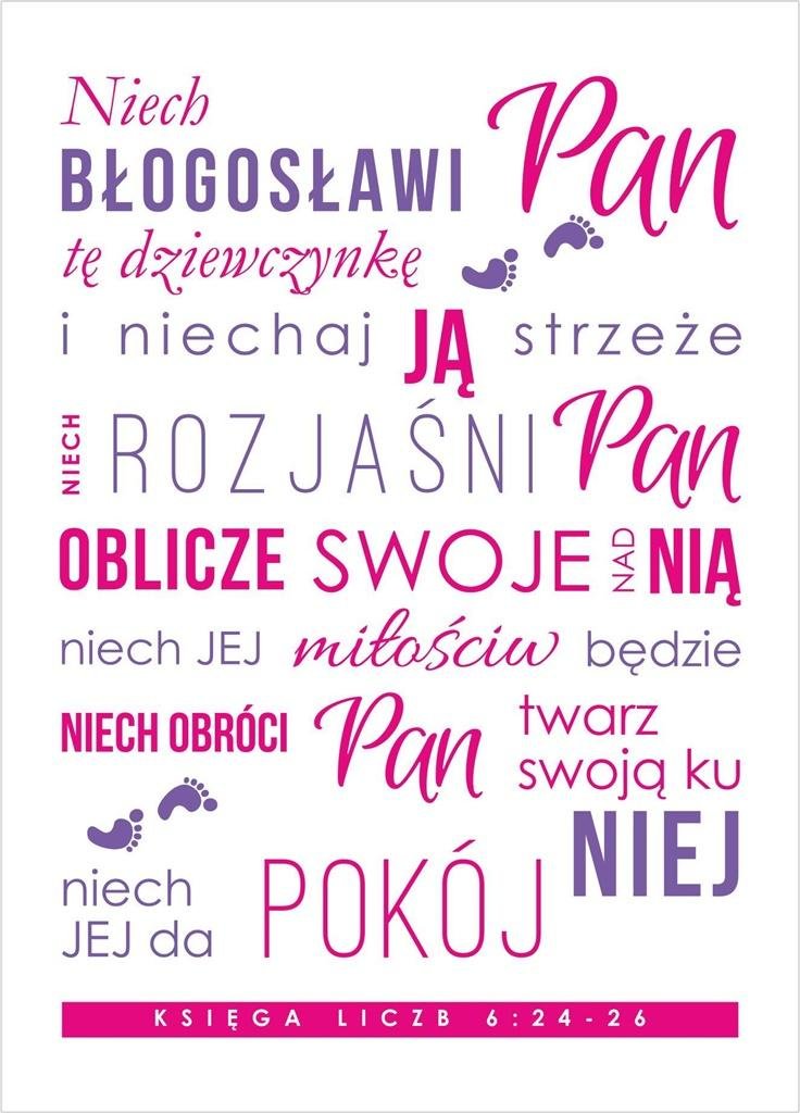 Niech błogosławi Pan tę dziewczynkę i niechaj ją strzeże. Niech rozjaśni Pan oblicze swoje nad nią, niech jej miłościw będzie. Niech obróci Pan twarz swoją ku niej, niech jej da pokój.Kartka okolicznościowa składana z kopertą.Format: C6 (114x162)Tekst w środku: brak prečítať celé