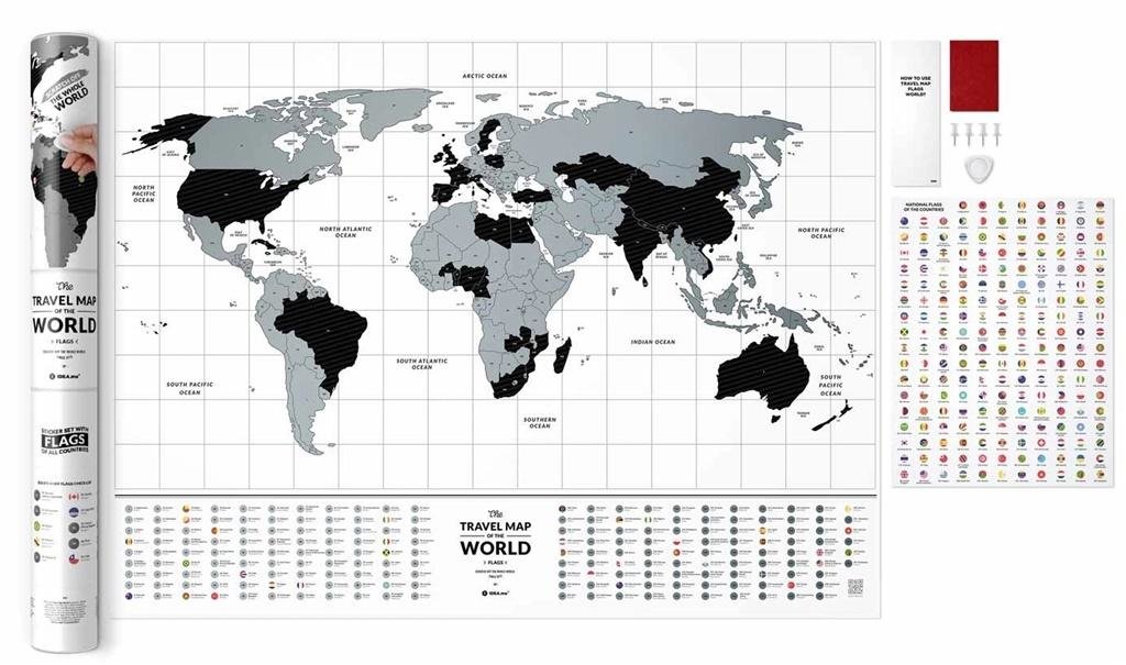 Travel Map Flags World to kolejny minimalistyczny projekt mapy do zdrapywania 1DEA.me.Unikatowy wygląd nadaje srebrna warstwa do zdrapywania nałożona na minimalistyczny czarny projekt mapy.Mapa wzbogacona została o flagi wszystkich krajów w formie zdrapywanej listy oraz zestawu naklejek. Możesz z...
