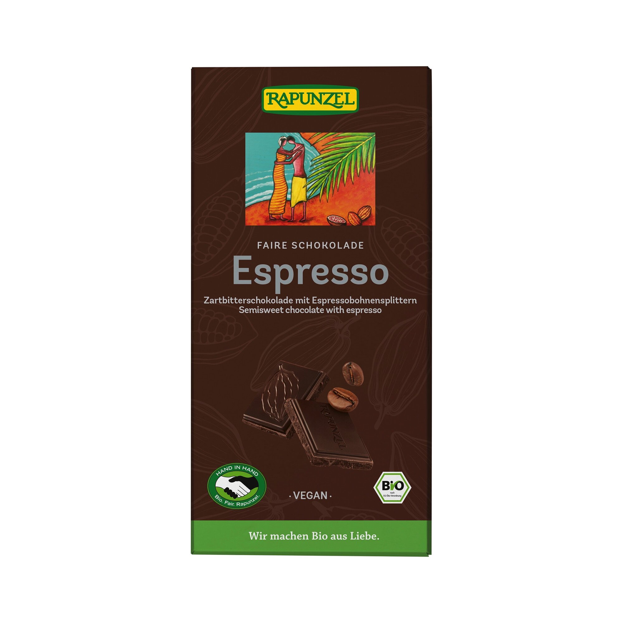 Cukr (sušená třtinová šťáva Rapadura, přírodní třtinový cukr Cristallino), kakaová hmota, kakaové máslo, drcené pražené kávové boby 7 %. Obsah kakaové sušiny nejméně 51 % v čokoládě. Může obsahovat stopy skořápkových plodů, mléka a sóji. *produkt kontrolovaného ekologického zemědělství
