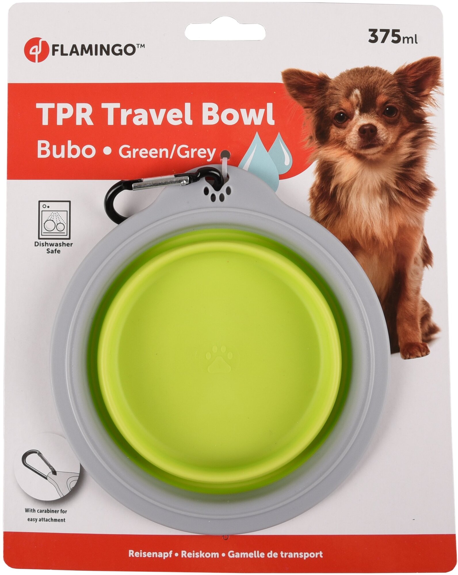 Flamingo cestovní miska je skládací, silikonová miska, kterou jednoduše zbalíte do batohu na jakýkoliv výlet s Vaším pejskem. Máte tak jistotu, že kdyklliv bude potřeba, misku jednoduše rozbalíte, nalijete do ní vodu a Váš pejsek uhasí žízeň. Barva zeleno/šedá. Objem 375ml.