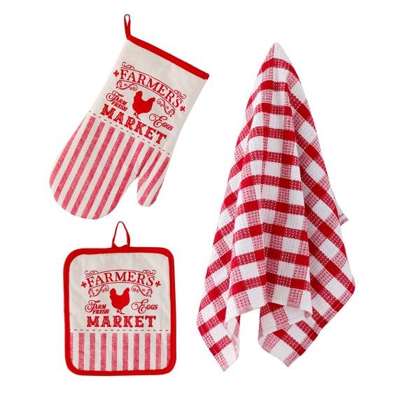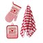 Kuchyňský set obsahující rukavici, chňapku a utěrku. Všechny tyto pomůcky Vám budou nejen praktickým pomocníkem ale i vhodným módním doplňkem Vaší kuchyně. Všechny části setu mají praktické poutko pro zavěšení. Materiál - povrch - 100% bavlna, výplň chňapky a rukavice - 65% bavlna, 35% polyester....