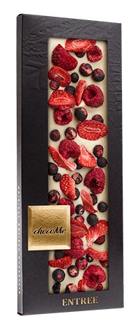 Biela čokoláda s čiernymi ríbezľami, plátkami jahôd a celými malinami