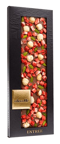 Mléčná čokoláda s lískovými ořechy, pistáciemi a kousky jahod