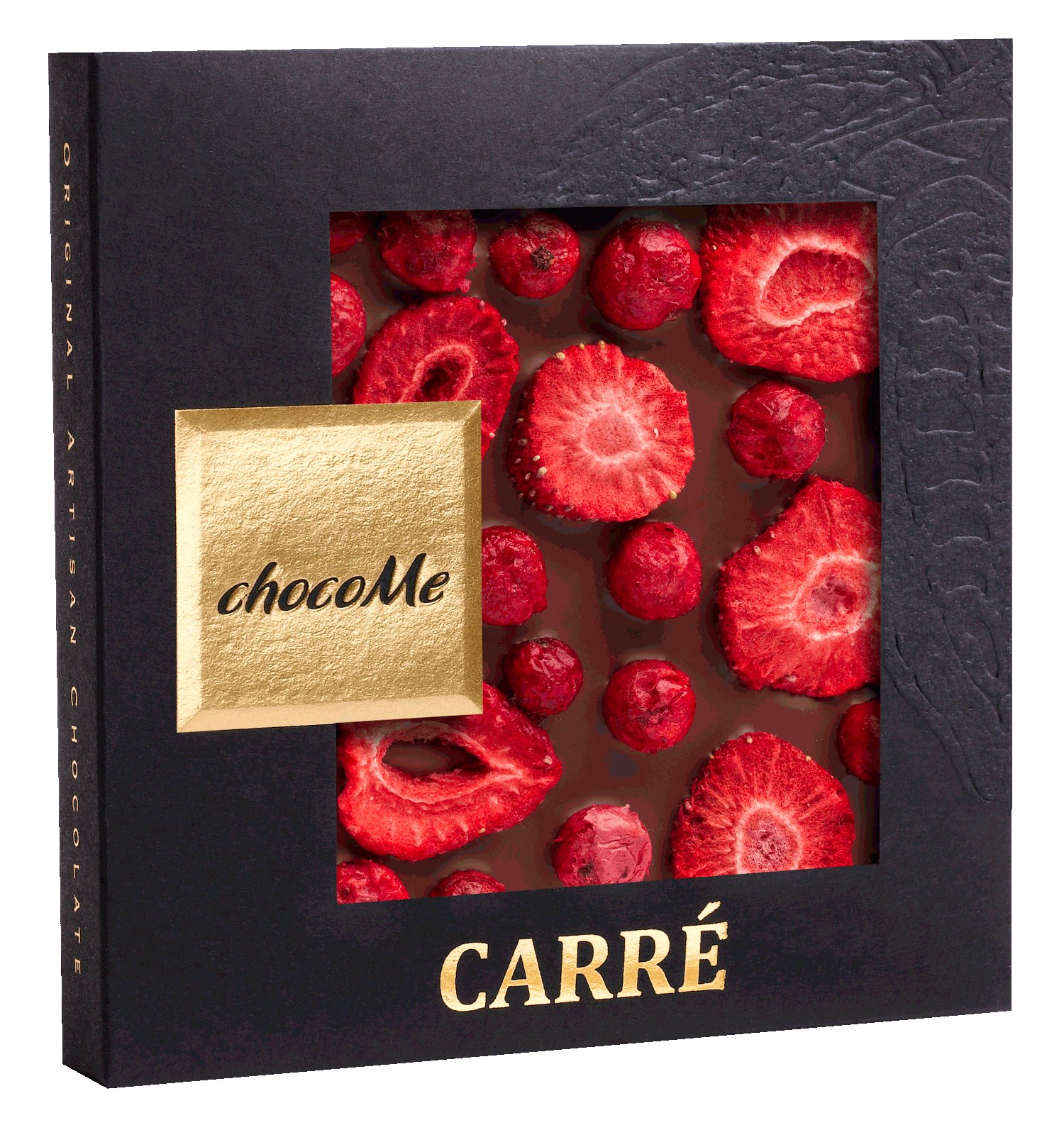Mléčná čokoláda s plátky jahod a červeným rybízem