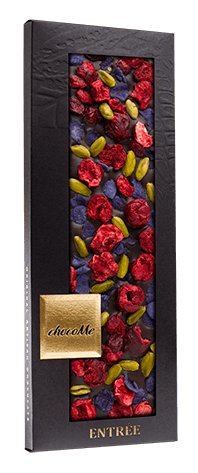 Hořká čokoláda s kandovanými lístky fialek, pistáciemi z Bronte a višněmi