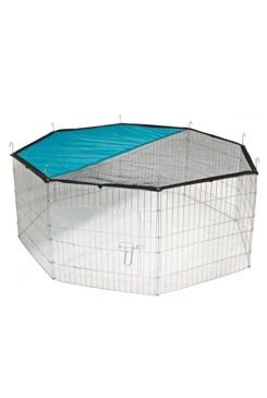 Výbeh sa skladá z ôsmich stien s rozmermi 57 x 56 cm, čím vytvorí plochu približne 1,5 m2, čo poskytuje dostatok miesta pre vaše zvieratká na pohyb a hru na čerstvom vzduchu. Konštrukcia je vyrobená z kvalitného pozinkovaného kovu, ktorý zaisťuje odolnosť proti poveternostným vplyvom a dlhú životnosť. Súčasťou výbehu sú praktické dvierka pre jednoduchý prístup, plachta na ochranu pred slnkom a ochranná sieť, ktorá chráni zvieratká pred nežiaducimi návštevníkmi a zároveň ich udrží vo vnútri výbehu.