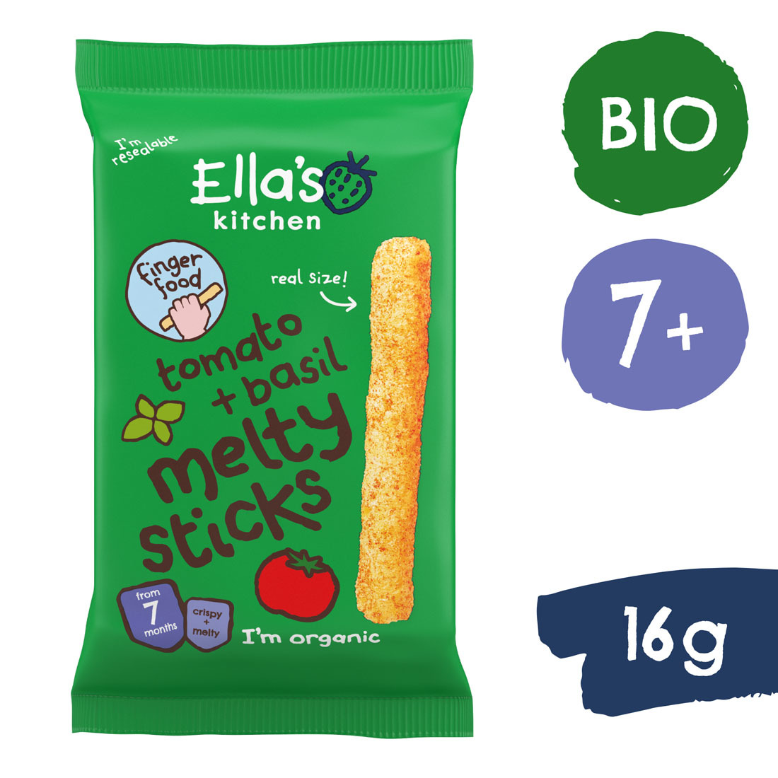 Lahodné kukuřičné tyčinky pro malé mlsounky, kterým už bylo sedm měsíců. Byly vytvořeny přímo pro malé dětské prstíky, které je díky tyčovému tvaru snadno uchopí a dopraví do pusy, kde se na jazyku rozplynou. Kromě toho, že tyčinky potěší dětské chuťové pohárky, naučí je rozeznávat chuť rajčátek...