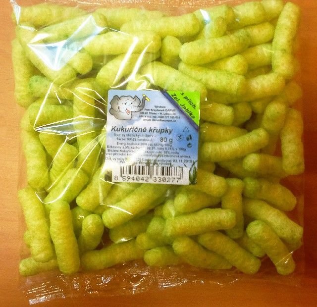 Vyrobeno - extruzí bez použití tuku, obalováno v upraveném cukru (mírně karamelizovaný).Složení : kukuřičná krupice, upravený cukr 20%, barvivo přírodní chlorofyl. přírodně identické aroma,voda.Ppoužití - pochutina bezlepková, jemné pečivo. prečítať celé