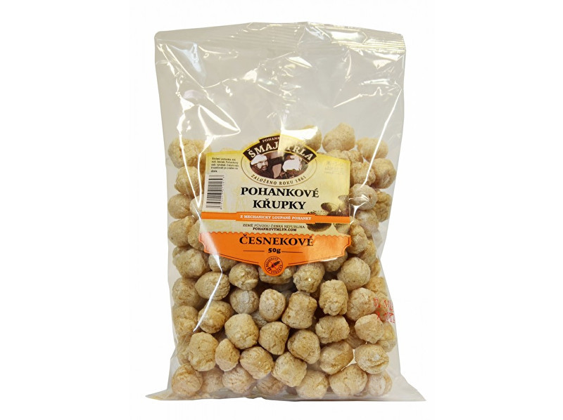 Pohankové křupky česnekové jsou oblíbenou pochoutkou zejména u dětí. Jsou přirozeně bezlepkové a lehce stravitelné. Vhodná součást k výletům i k večernímu mlsání. Pohankový extrudovaný výrobek. Složení: Pohanka, sůl, sušený česnek Obsah: 50 gZemě původu: Česká republikaVýživové údaje ve 100g:Energetická hodnota 1540 kJBílkoviny 9,3gSacharidy 75,6gTuky 2,1g