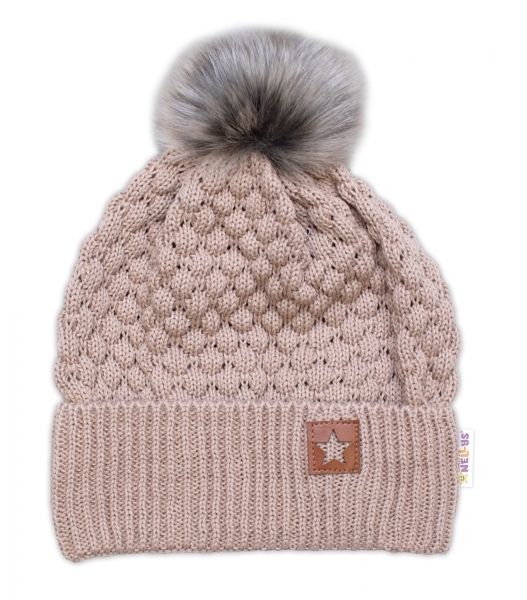 Zimní čepice Star s chlupáčkovou bambulkou - béžová; 98-104 (2-4r)