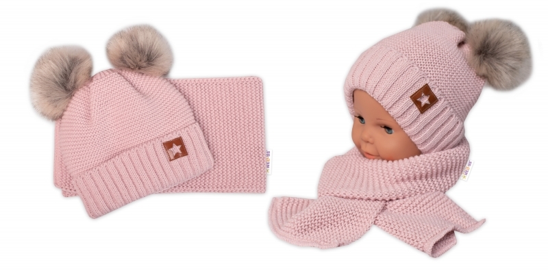 Zimní čepice s kožešinovými bambulemi + šál Baby Nellys Star - pudrová, 6/24 měsíců; 80-92 (12-24m)