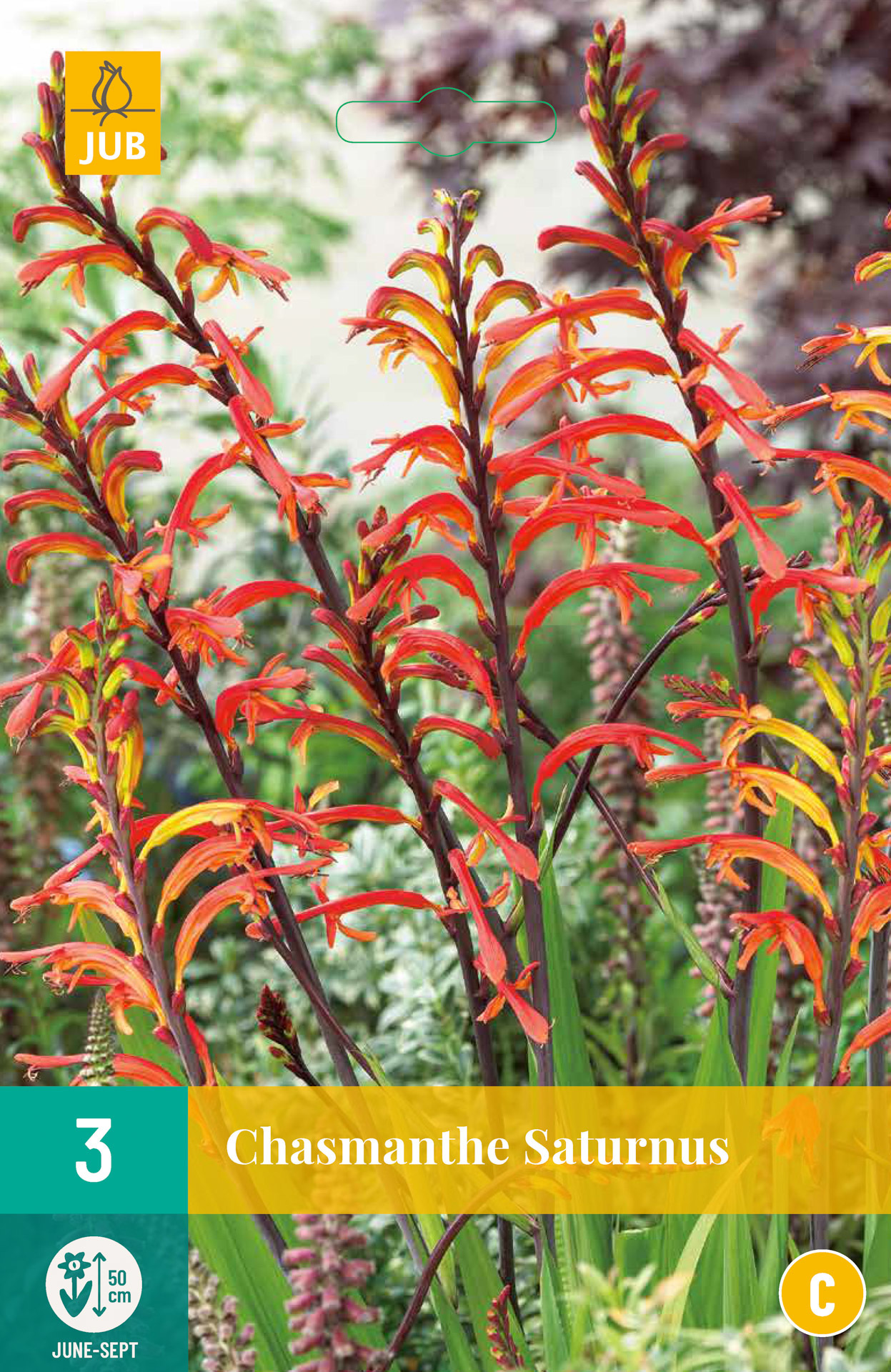 Druh: CHASMANTHEZemě původu: HolandskoVelikost cibule: 12/+Výška rostliny: 100 cmVýsadba: duben-květenHloubka výsadby: 10 cmSpon: 10 cmOdrůda:SATURNUS: 1 karta á 1 ks cibule Cibuloviny balené v kartách s barevným obrázkem. Základní údaje o pěstování formou piktogramu. Cibuloviny nejsou mořené.