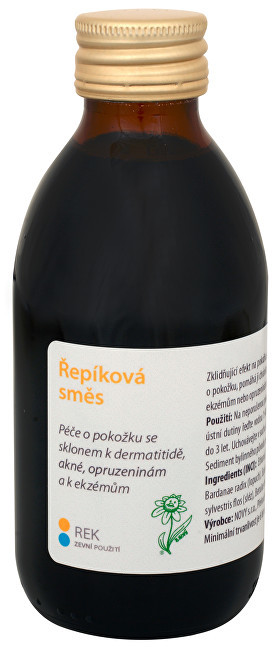 Řepíková směs REK je směs na podporu přirozeného hojení kůže a mírnou dezinfekci pokožky.Jak používat:K oplachům, obkladům či potírání tampónem. Případně lze naředit vodou pro úsporu a snížení koncentrace. prečítať celé