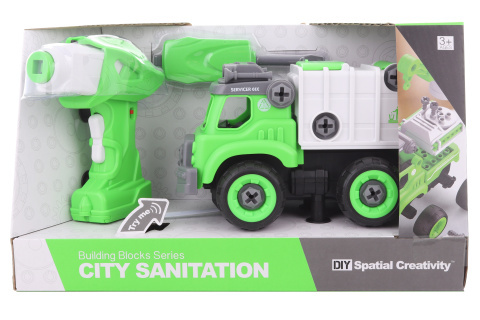 Šroubovací popelářské auto na dálkové ovládání. Auto lze sešroubovat pomocí přiloženého šroubováku nebo vrtačky. Z vrtačky lze vyndat motorek, který se vloží do auta a to poté jezdí pomocí ovládání dopředu a dozadu. Auto také vydává zvuky. Napájení na 4 AA baterie (nejsou součástí) a na 3 AG13...