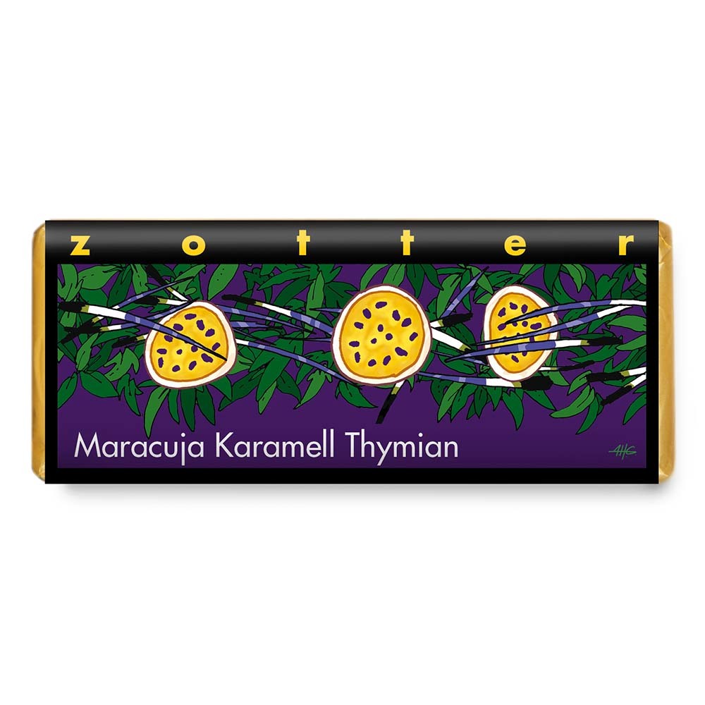 Zotter Bio mléčná čokoláda Marakuja, karamel a tymián, 70 g
