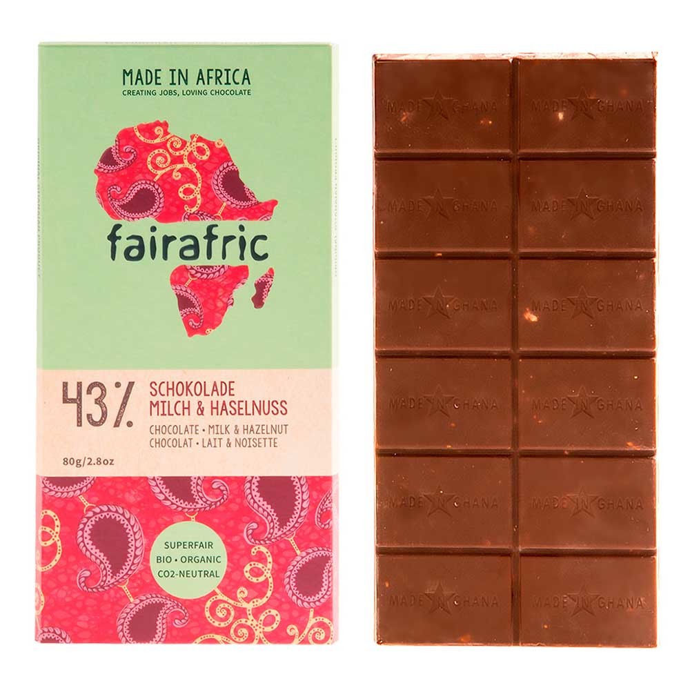 Fairafric Bio mléčná čokoláda s lískovými oříšky, vyrobená v Ghaně, 80 g