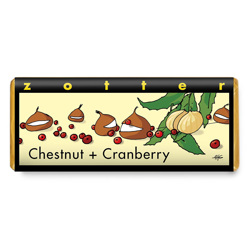 Zotter Bio mléčná čokoláda Kaštany a brusinky, 70 g