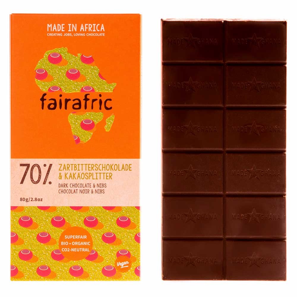 Parádní hořká čokoláda se 70 % toho nejlepšího ghanského bio kakaa vypěstovaného v Ghaně. Zde se také kakao zpracovává a vyrábí se z něj celá tabulka čokolády včetně obalu. Čokoládu na povrchu zdobí kousky kakaových bobů, ze kterých byla vyrobena. To jí dodává nevšednosti, křupavosti i vizuální...