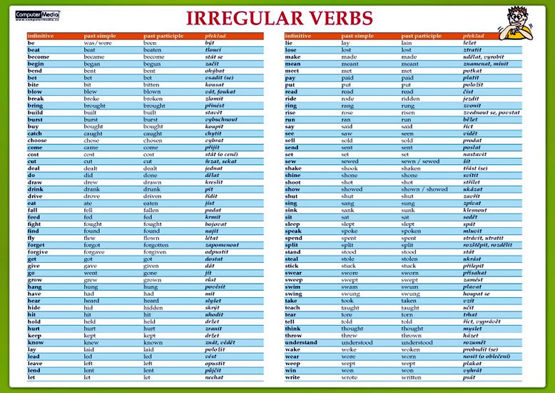 Karta formátu A4 vytištěná na tvrdém laminovaném kartonu. Karta je užitečnou pomůckou při výuce anglického jazyka. Na jedné straně je v přehledné tabulce vyobrazen seznam nepravidelných sloves. Na druhé straně jsou pak příklady vět, jak se nepravidelná slovesa používají. Karta tak slouží k rozšíření slovní zásoby a k osvojení základního použití slovíček.