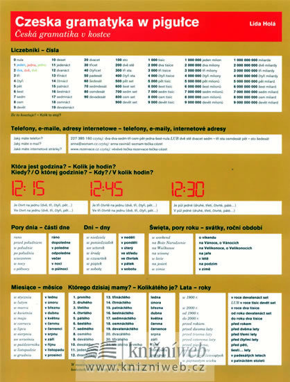 Polská verze čtyřstránkové příručky o něco většího formátu než A4, tištěné na oboustranně laminované křídě. Oblíbená příruční pomůcka pro výuku českého jazyka představuje jednoduchý přehled nejdůležitějších gramatických a lexikálních jevů. Je určena začátečníkům a středně pokročilým studentům...
