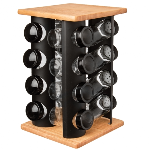 16dílná sada kořenek je uložena v otočném stojanu, ze kterého je snadno vyjmete a do něj opět uložíte. Máte skvělý přehled o uloženém koření. Zabere velmi malý prostor. Materiál: stojan - dřevo, nerez s černým povrchem, skleněné kořenky jsou opatřeny plastovými sypátky PE a uzávěry na závit....