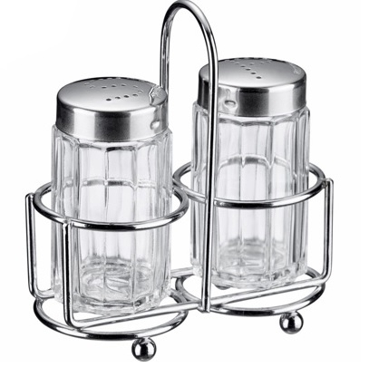 Tradiční koření na sůl a pepř. Objem: po 50 ml. Skládá se ze slánky a pepřenky a stojanu s rukojetí.  prečítať celé
