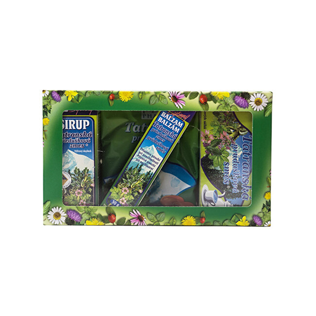 Dárkové balení Tatranská průdušková směs obsahuje 1x čaj 20 x 1 g, 1x sirup s cukrem 100 ml, 1x bylinný drops 60 g, 1x balzám v tubě 30 g. prečítať celé