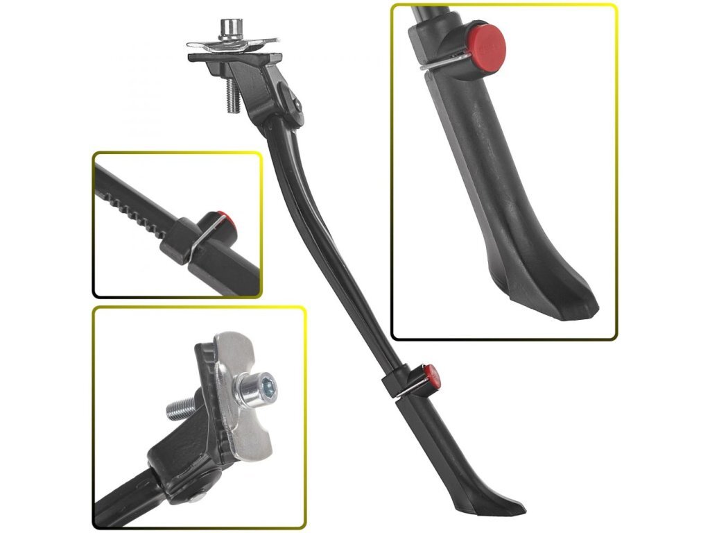 Stojan na jízdní kolo, středový, nastavitelný, 24"-29" KELTINUniverzální středový stojan pro kola velikostí 24" - 29". Nastavení optimální délky stojanu v deseti polohách.Při montáži šroub dotáhnout jen lehce, zkontrolovat, jestli stojan nezasahuje do výpletu zadního kola a zda nepřekáží pohybu...