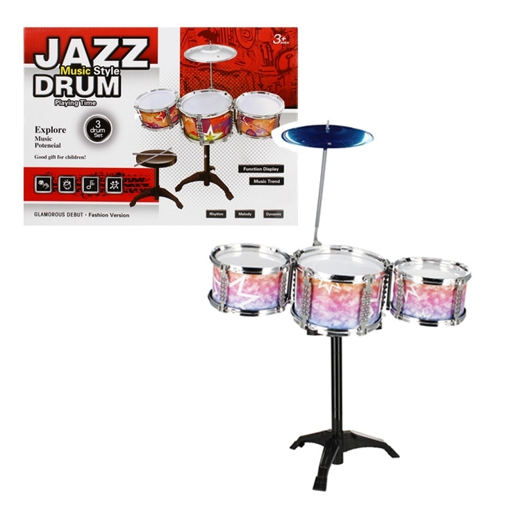 Set bicí. Jeho obsah je 3 bubny různých velikostí, 1 činel, 2 malé hůlky, taburetka. Rozměry produktu jsou velký buben-21x13x21cm, malý buben-17x10x17cm, židle-27x25cm. Souprava je určena pro děti ve věku 3+. prečítať celé