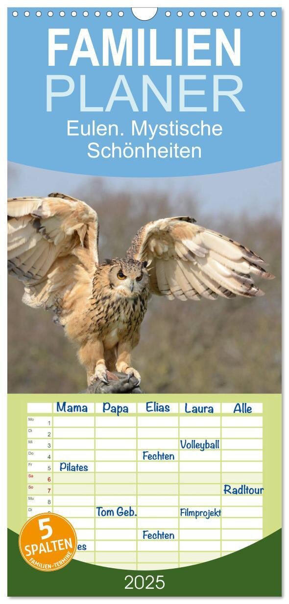 Familienplaner 2025 - Eulen. Mystische Schönheiten mit 5 Spalten (Wandkalender, 21 x 45 cm) CALVENDO (německy)
