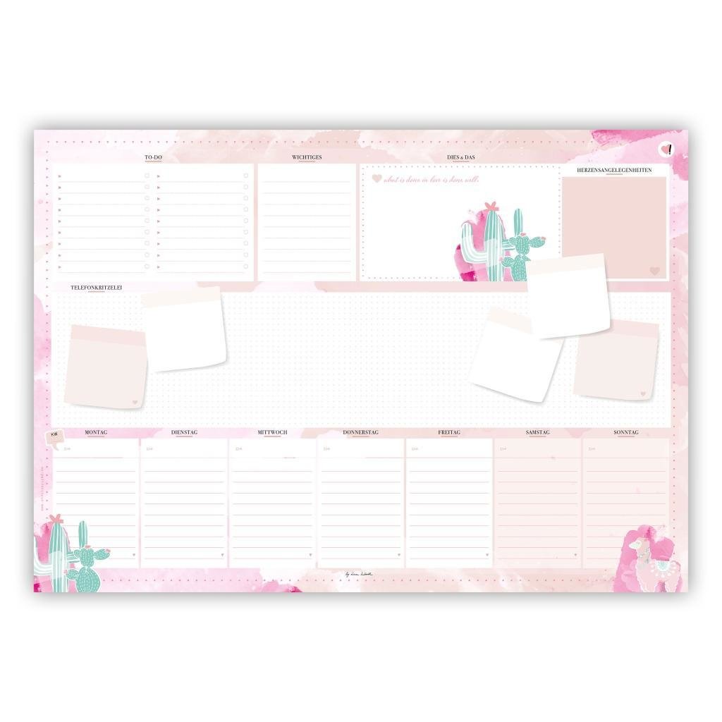 Rosa Schreibtischunterlage in DIN A2 aus Papier zum Abreißen. Mit Kaktus und Alpaka Motiv. Design in rosa und pinkem Aquarell, b (německy)