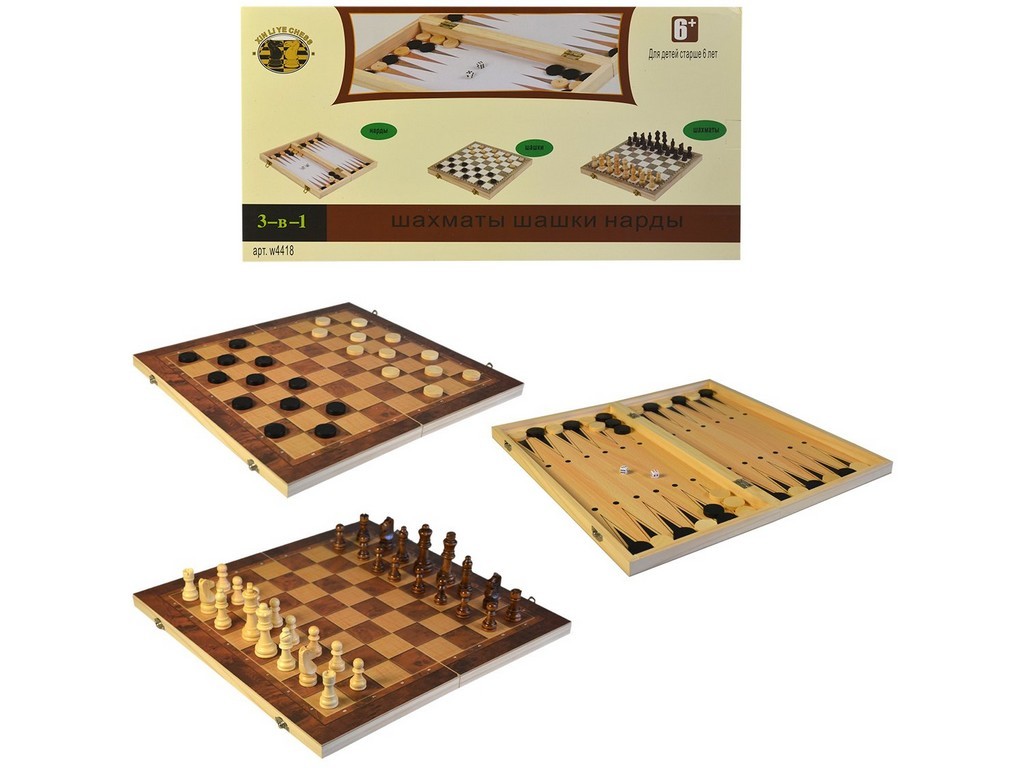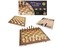 Společenská hra šachy, dáma a backgamon. Velikost boxu 44 x 22,5 x 4,5 cm. Velikost hrací desky 43 x 43 cm. Velikost figurky krále 8 cm. Figurky jsou dřevěné. Hrací deska slouží zároveň jako box pro úschovu figurek a hracích kostek. prečítať celé