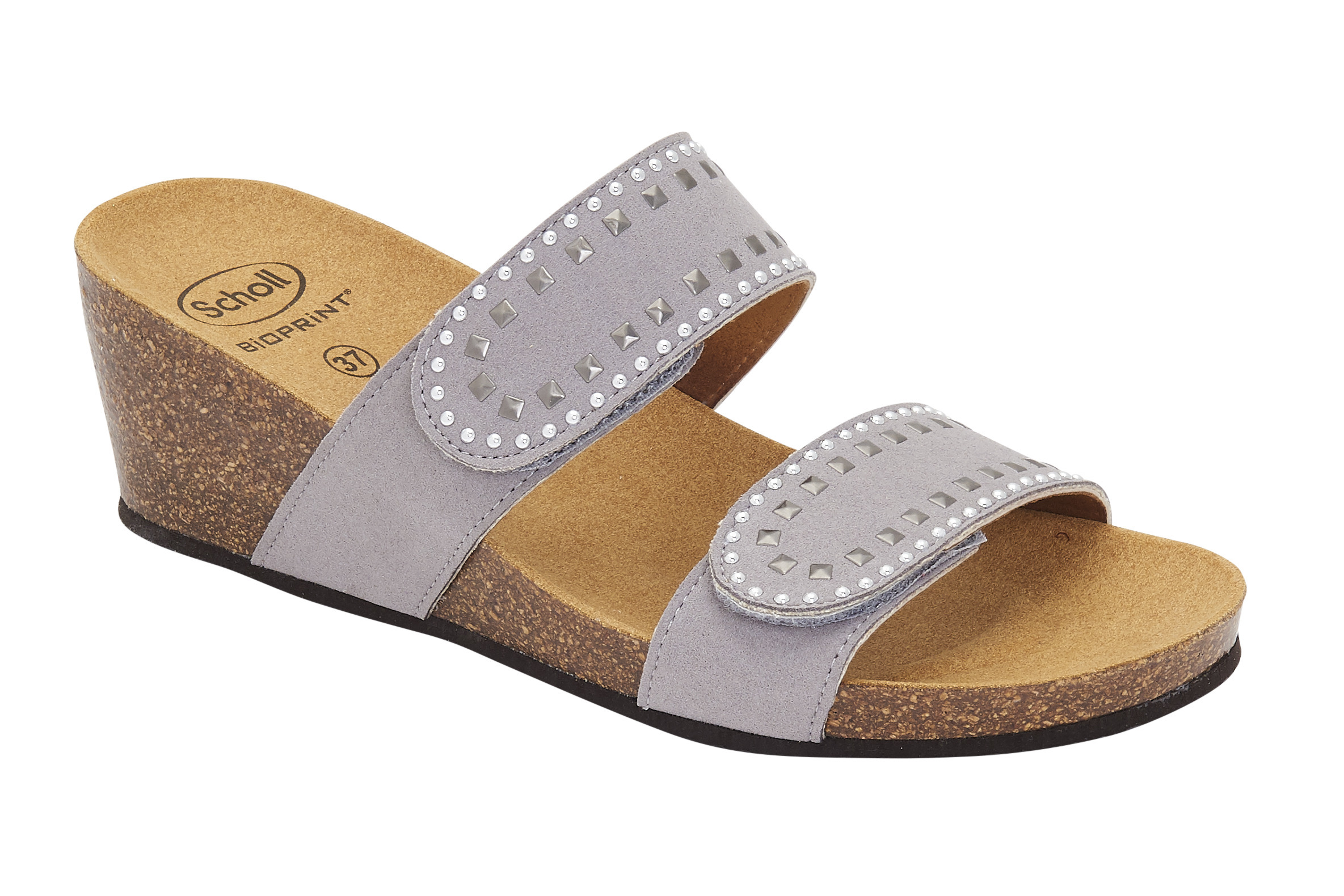 Pantofle SCHOLL Michelle jsou zdobeny dvěma řadami stříbrných cvočků, které podtrhují jemný design této obuvi.Pohodlných pásky jsou ideální pro ženy, které chtějí spojit pohodlí s jednoduchou elegancí. 5,5 cm klín zajišťuje vynikající stabilitu. Typický komfort Scholl zaručují jak nastavitelné...