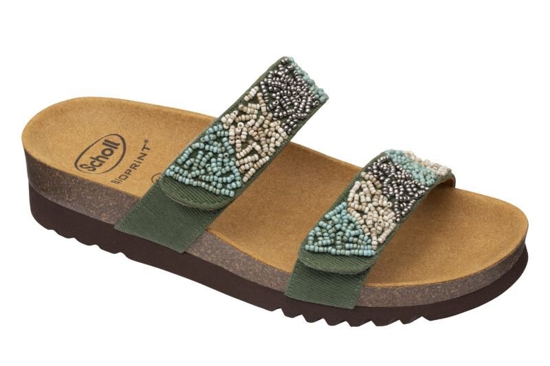 Model Zafirah od firmy Scholljsou pantofle s dvěma pásky na suchý zip pro snadné a pohodlné nastavení ozdobené barevnými korálky. Umožňují dokonalé přizpůsobení Vaší noze.Stélka Bioprint podporuje nožní a prstovou klenbu a drží chodidlo díky patnímu lůžku ve správné formě.Scholl Bioprint® má...