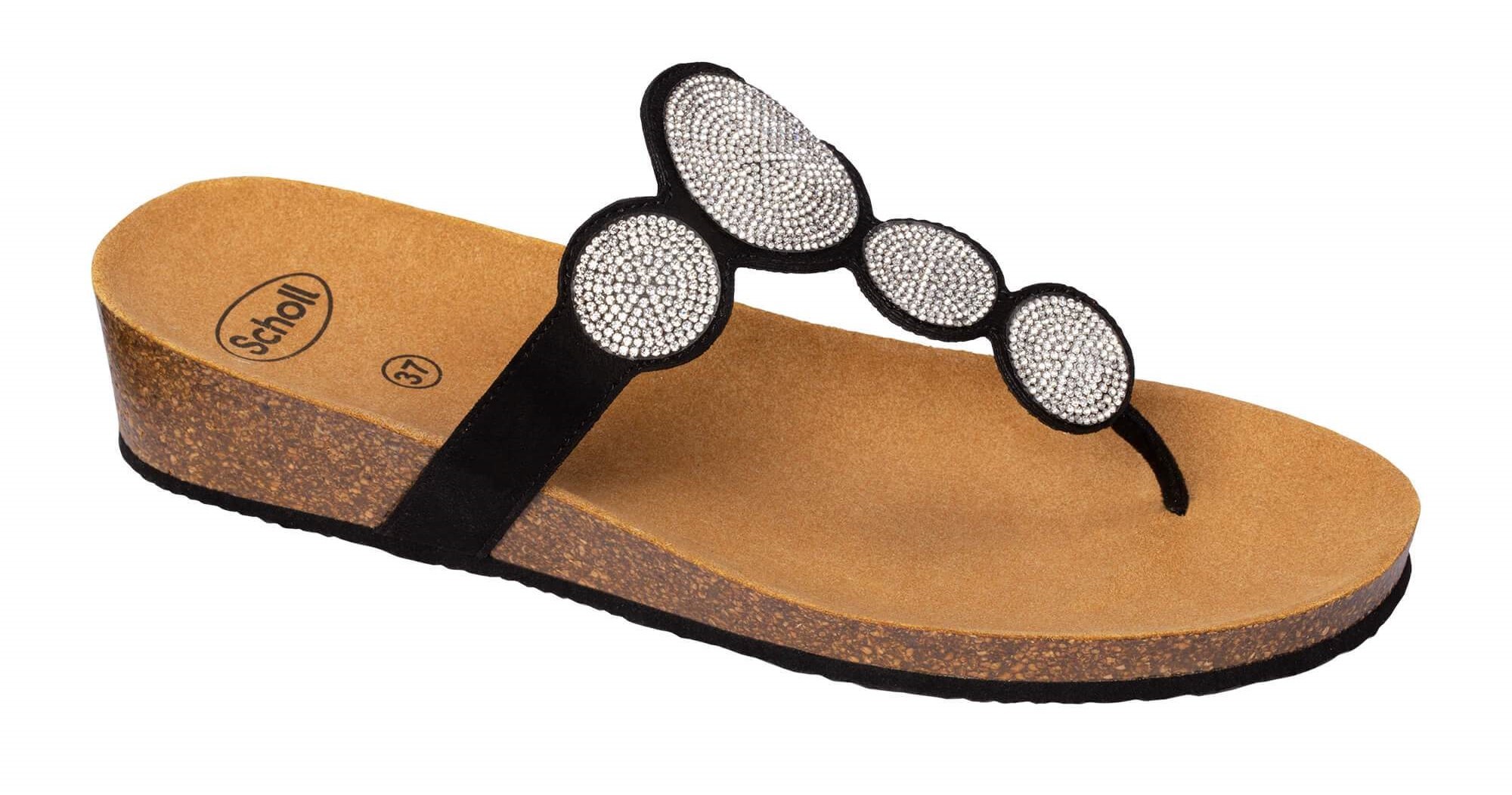 je novinka od firmy Scholl. Jedná se o pantofle - žabky na klínku ozdobené zirkony s korkovým klínkem a semišovou stélkou. Barva černá