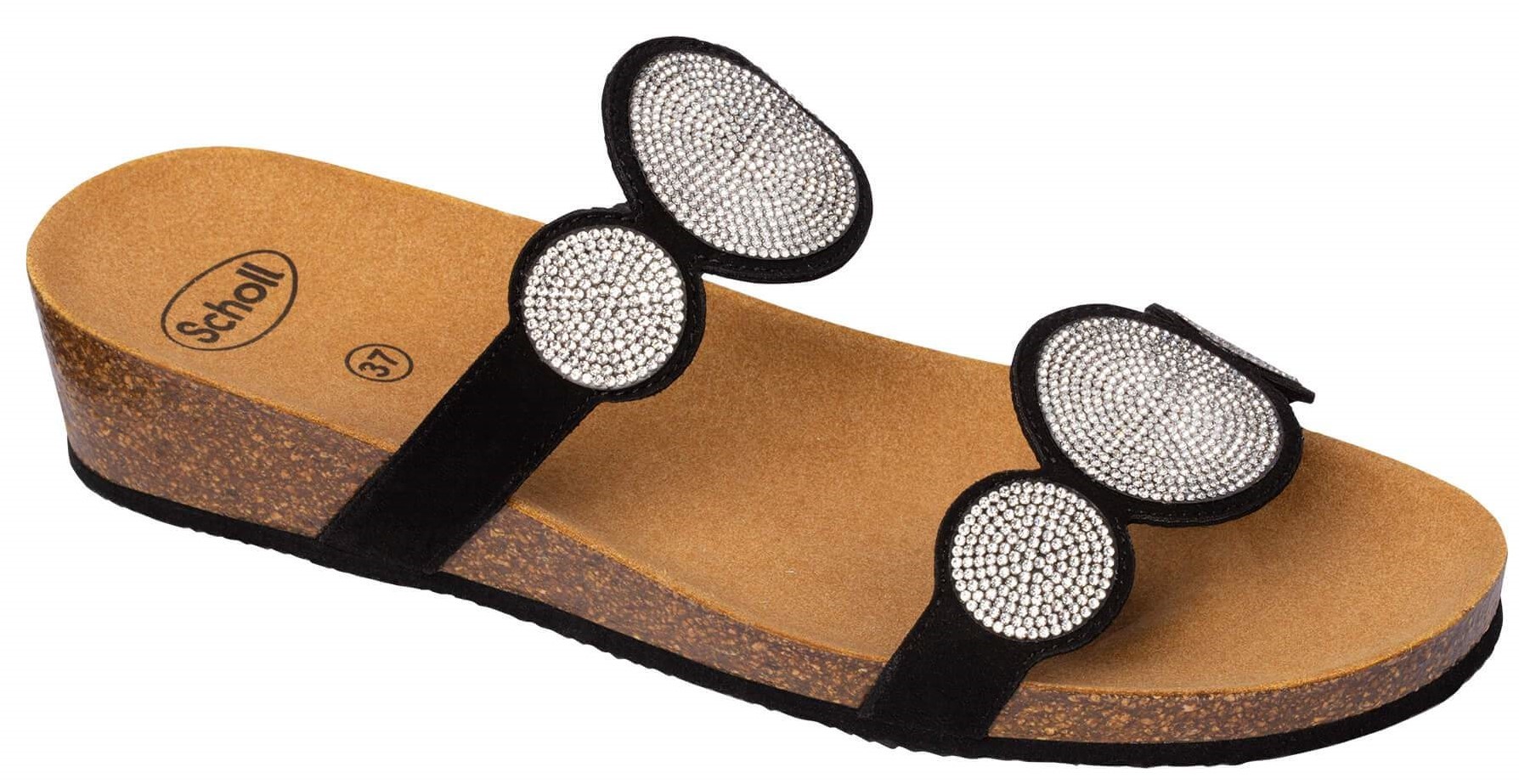 Model Sharon Flip Flopje novinka od firmy Scholl. Jedná se o pantofle na klínku ozdobené zirkony s korkovým klínkem a semišovou stélkou. Barva černá Detaily produktu Výška podpatku:40 mm Černá barva Vyjímatelná vložka: ne Materiál podšívky: syntetika Materiál stélky: mikrovlákno...