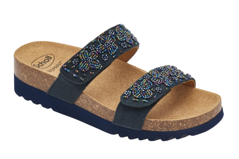 Model Zafirah od firmy Scholljsou volnočasové pantofle s dvěma pásky na suchý zip pro snadné a pohodlné nastavení ozdobené barevnými korálky. Umožňují dokonalé přizpůsobení Vaší noze.Stélka Bioprint podporuje nožní a prstovou klenbu a drží chodidlo díky patnímu lůžku ve správné formě.Scholl...