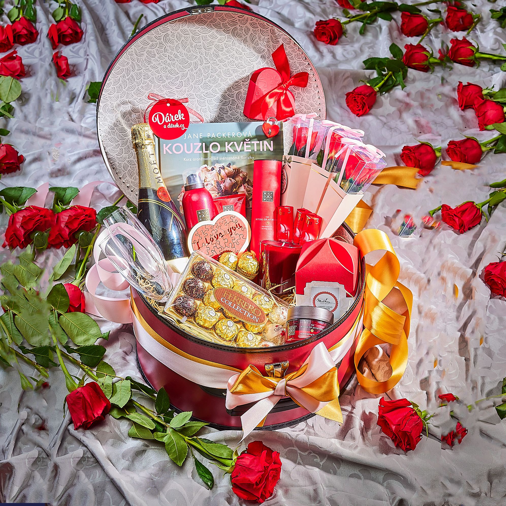 Luxusní kloboukový kufříkChampagne Möet & Chandon 0,75Sklenky na ChampagneLuxusní kazeta Rituals AyurvedaSkvělé vonné tyčinky RitualsČokolády Mon ChériPralinky kolekce FerrerroLuxusní čokoládové pralinky MathézMýdlové růžeVelká o kniha aranžování květinZámek láskyKrabička ve tvaru srdce s...