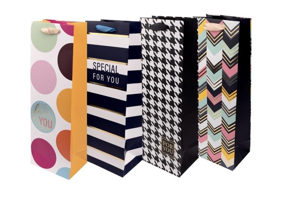 Torebka ozdobna na butelkę o wymiarze 12x35x9,5 cm.Dostępna w 4 kolorach.Posiada wzmacniany spód.Mix wzorów, produkt wysyłany losowo, cena za 1 sztukę prečítať celé