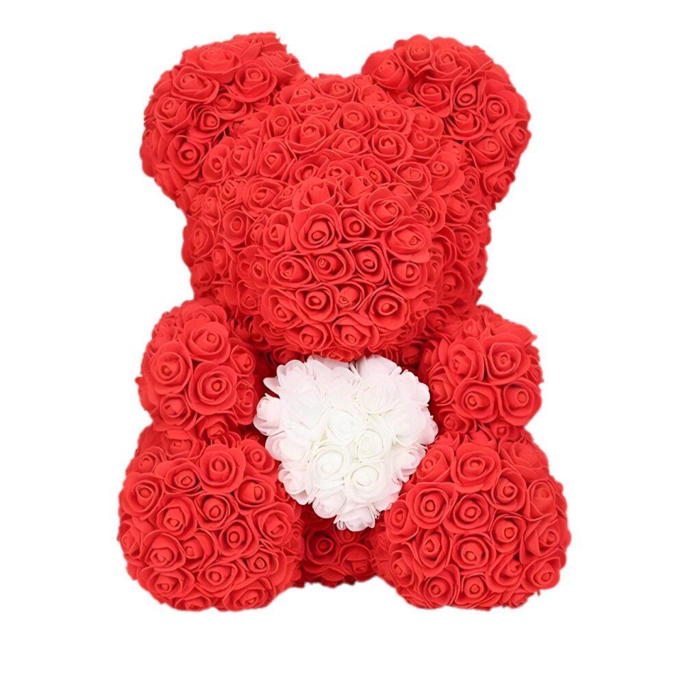 Medvídek z růží – červený s bílým srdcem, výška 35 cm